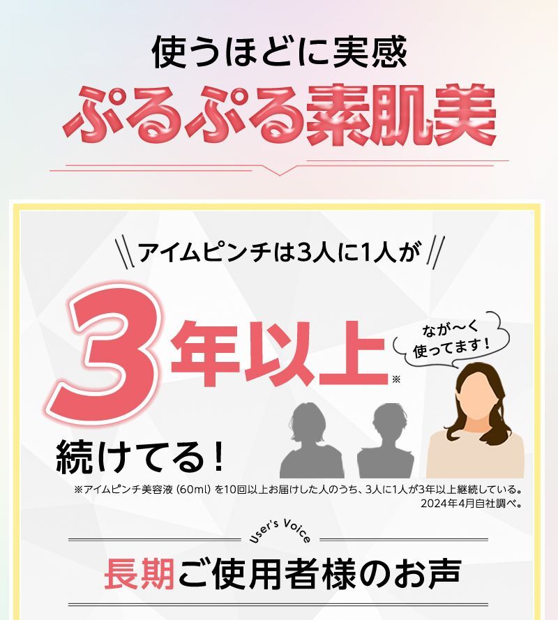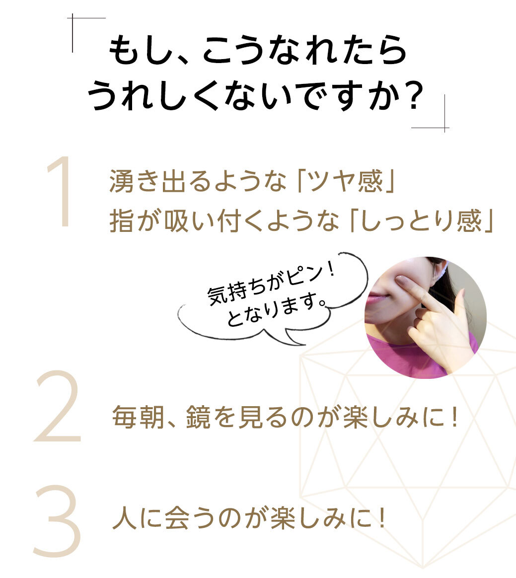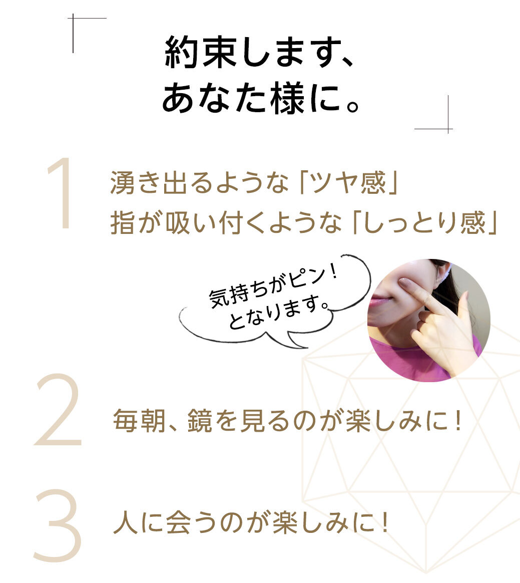 - 効果実感のためには毎日使っていただくのがおすすめです。 お薬ではないため、継続して使っていただくことでお肌のキメを整え うるおいを保ち、健やかなお肌に導いてくれます。