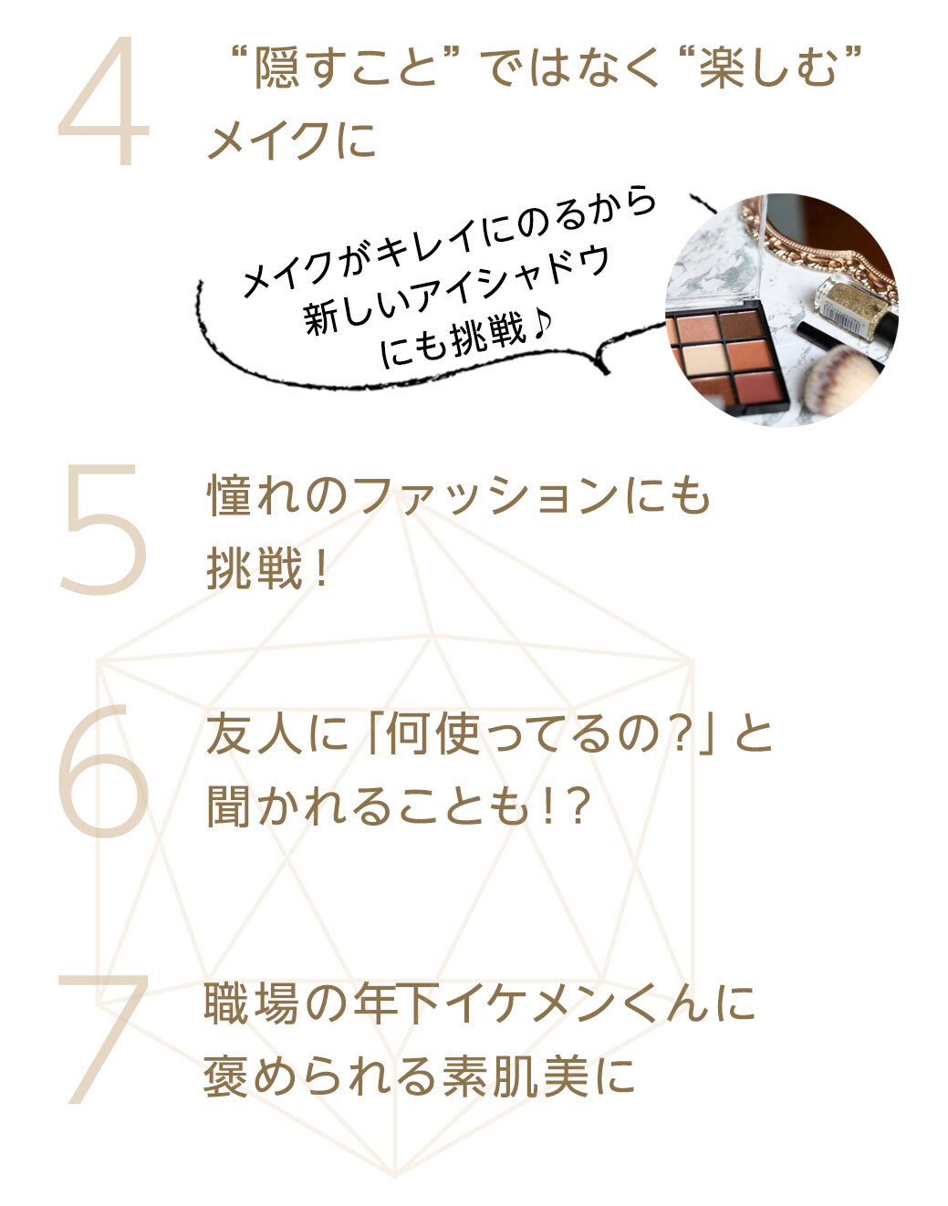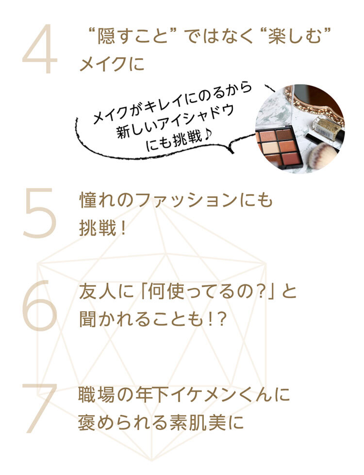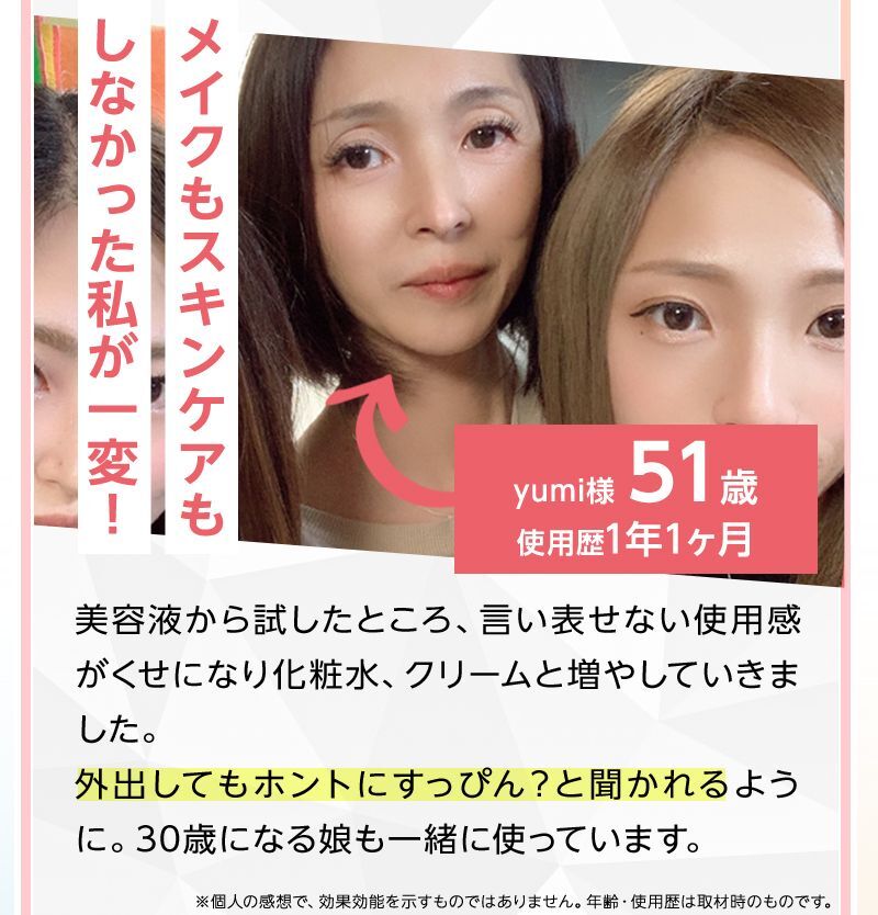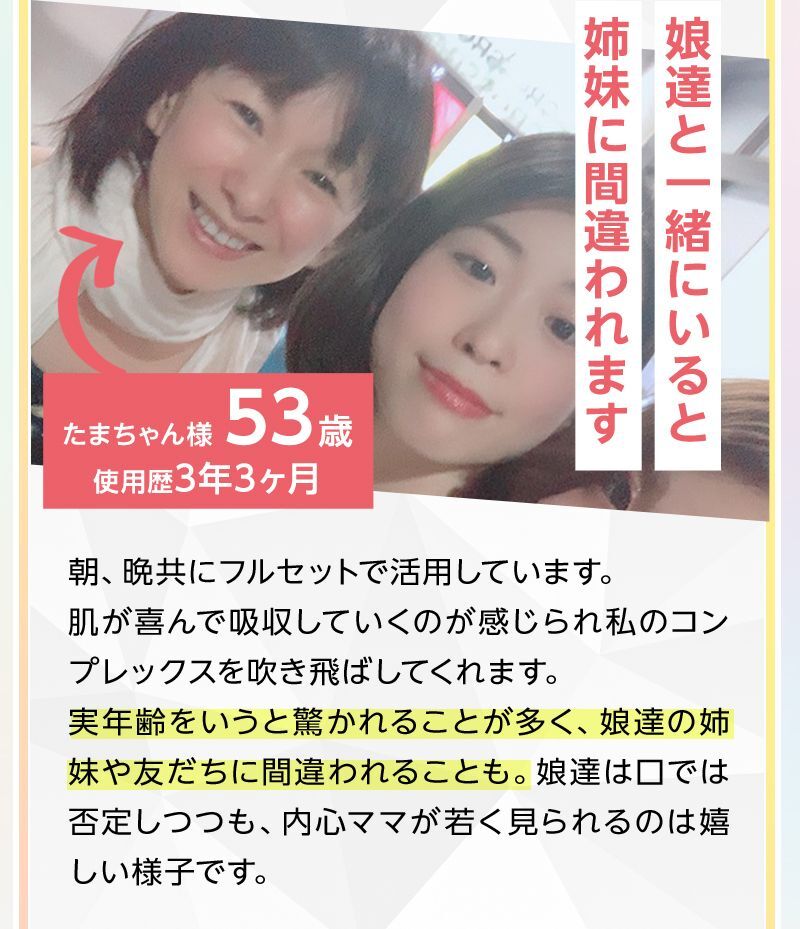 - 効果実感のためには毎日使っていただくのがおすすめです。 お薬ではないため、継続して使っていただくことでお肌のキメを整え うるおいを保ち、健やかなお肌に導いてくれます。
