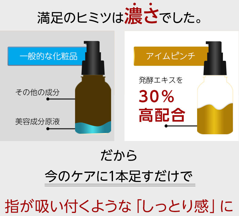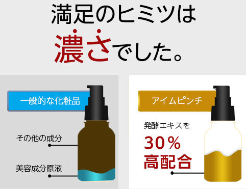 - とろりと濃密で、翌朝のもっちり感触が嬉しいジェルタイプの美容液です。 発酵エキスを30%も高配合しているのはアイムピンチならではの特徴です。