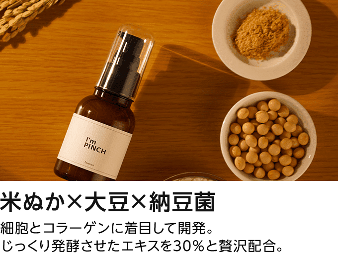 - どなたでもお使いいただきやすいようにあえて香りづけや、 香料の配合をしておりません。ただ、原料自体の匂いをかすかに感じることがございます。 実はその香り、 お届けしている美容液が新鮮であることの証なのです。 アイムピンチ美容液は、 国産の大豆と米ぬかを納豆菌で発酵してできた 「コラーゲン発酵活動エキス」 という成分をたっぷりとお入れしております。 毎回菌からできているがゆえに、 香りにも多少の差が出てしまいますが、 お客様のお肌に安心してご使用いただけますよう、 素材を生かした香りのままにしております。