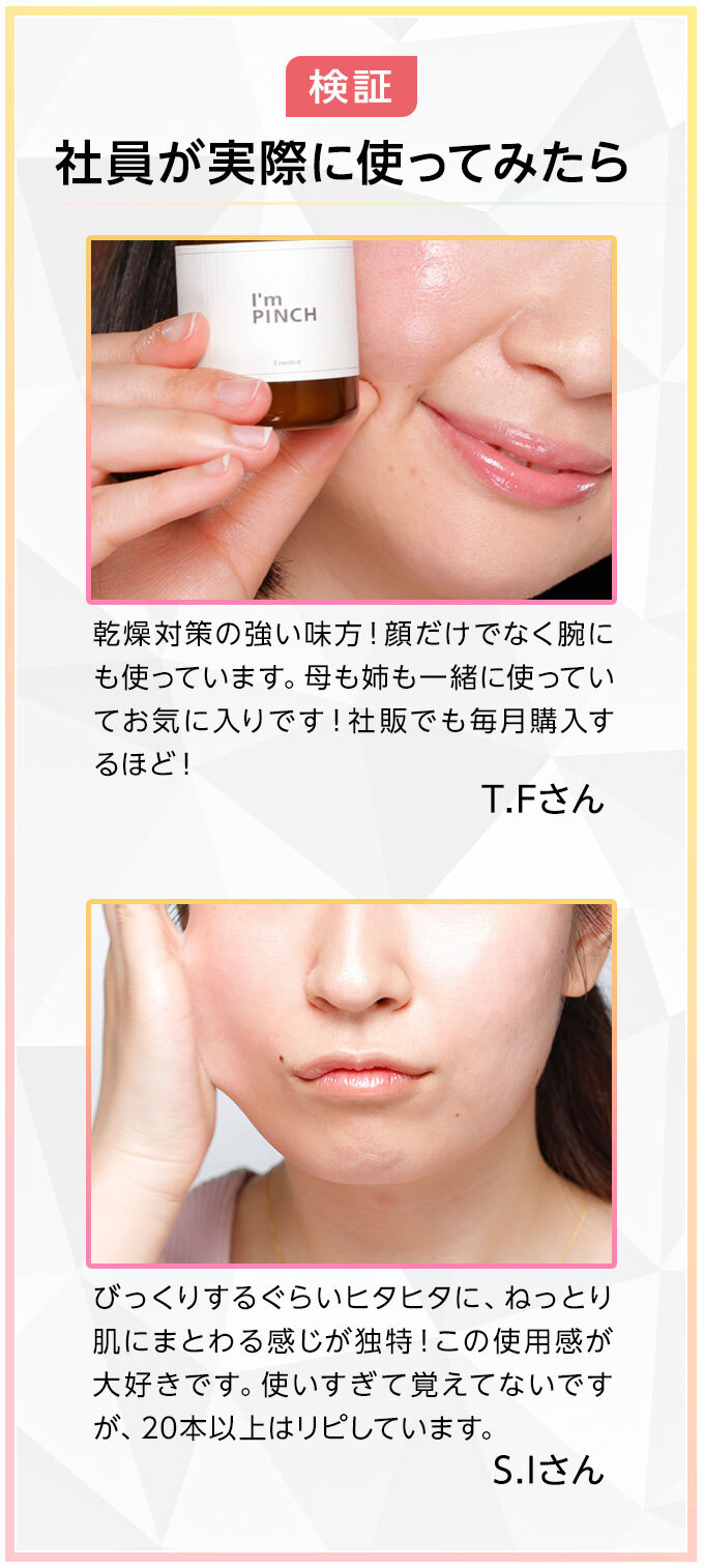- アイムピンチは多くの方に気持ちよくお使いいただくために配合成分にも十分配慮しておりますが、