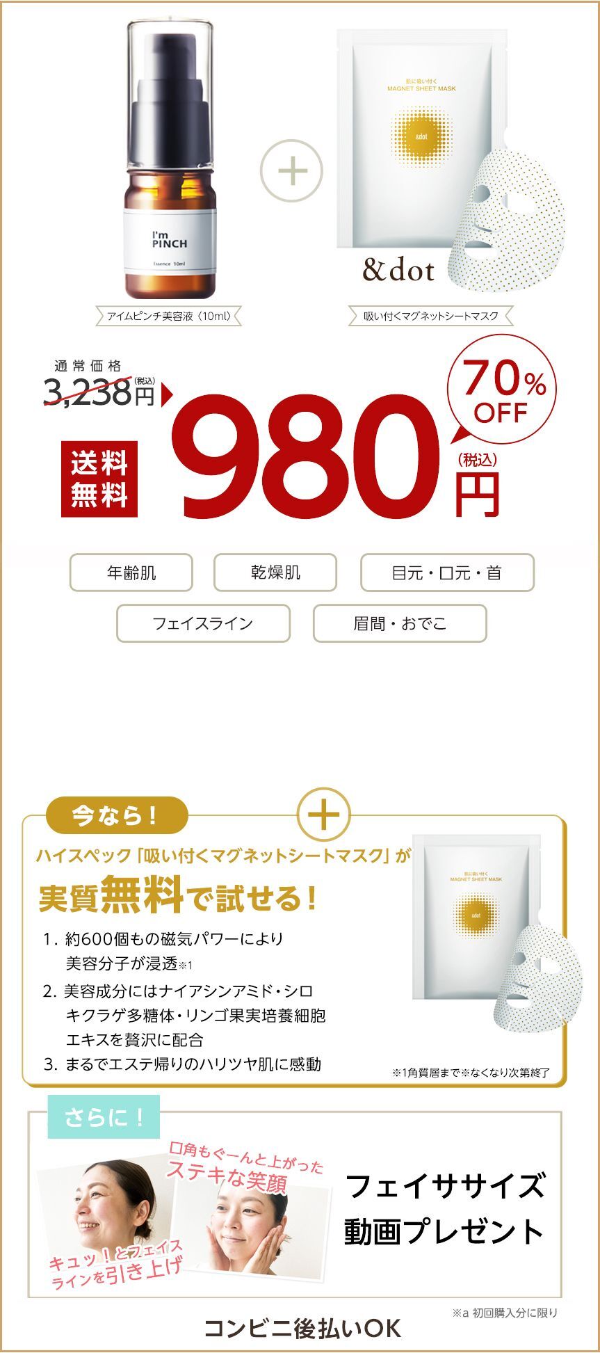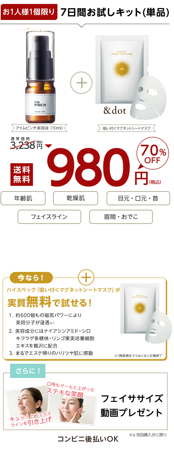- はい、併用可能です。アイムピンチの美容成分を逃さないためにも「アイムピンチ美容液→オールインワンゲル」の順番でお使いくださいませ。
